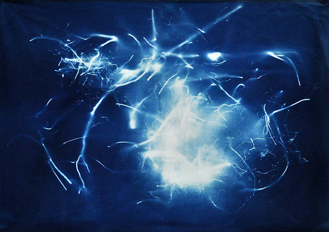 The roots appear in the images partly as clear, precise lines, representing the path of growth and anchoring. Other roots, however, form chaotic, tangled patterns, reflecting the wild, often untamed character of nature. The use of cyanotype with its characteristic blue-and-white tones gives the images a mystical atmosphere that evokes the sky, stars, and lightning—representing the invisible yet omnipresent forces of nature.