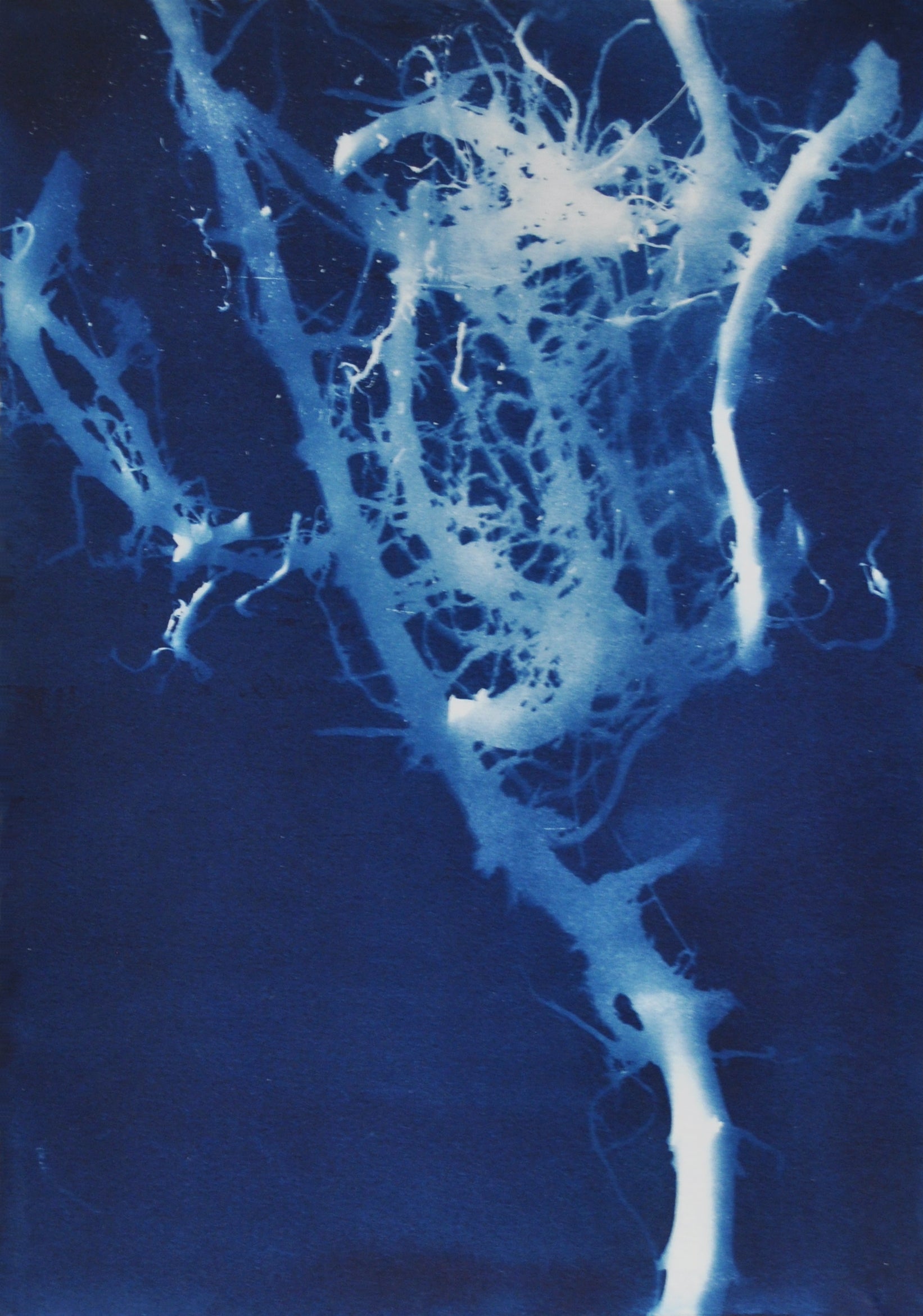 As in the other series of the artist where light and matter merge, here too the duality of order and chaos becomes visible. The photograms are snapshots of the living process hidden within the roots, while also an attempt to make the invisible visible. Just as light plays with objects on the paper in the cyanotype process, the calm of meditative gardening merges with the dynamism of nature and the deep, almost spiritual experience of these roots.